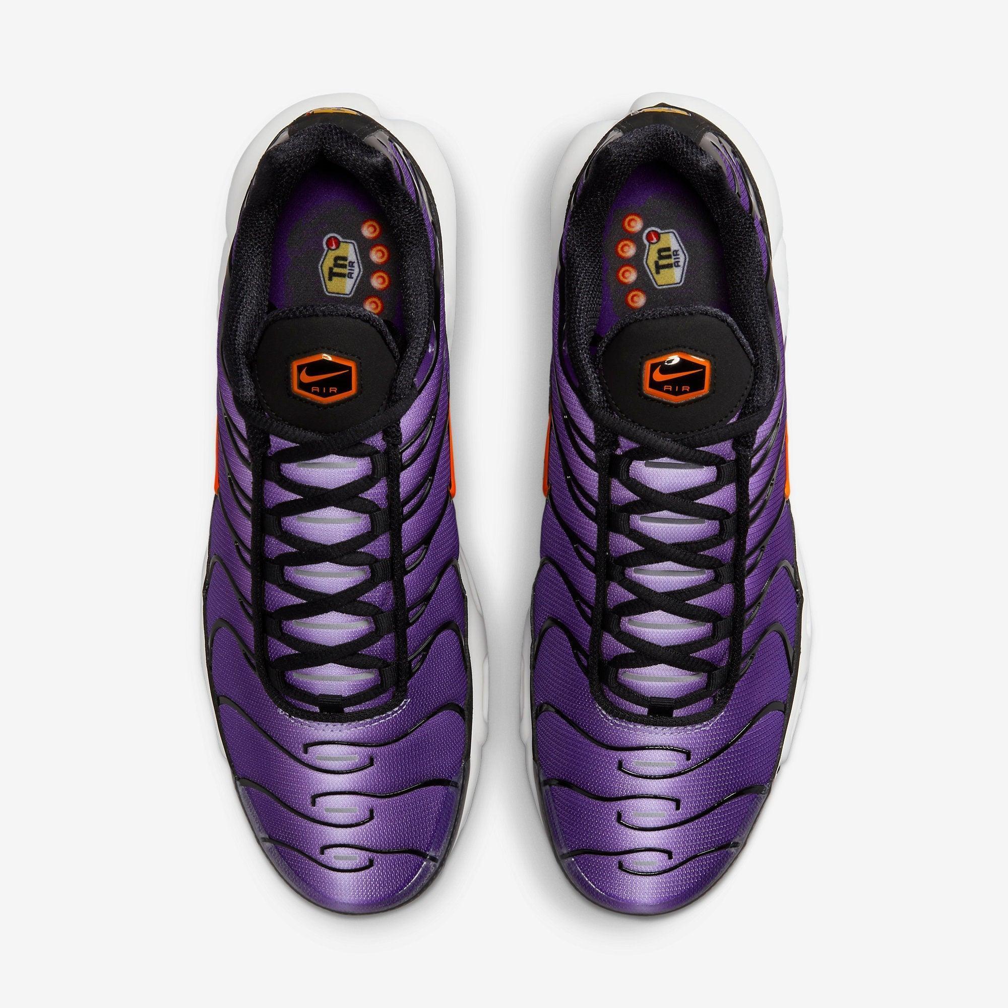 Το Nike Air Max Plus OG Voltage Purple (2024) είναι μια επανέκδοση του αρχικού sneaker. Αυτό το ζωντανό παπούτσι γιορτάζει την 25η επέτειο του μοντέλου Air Max με μια απόχρωση Voltage Purple με Total Orange τόνους. Το επάνω μέρος είναι κατασκευασμένο από αέρινο πλέγμα με δερμάτινες αποχρώσεις σε μαύρο χρώμα στη γλώσσα, λασπωτήρα και τη φτέρνα. Όπως και άλλα μοντέλα Nike Air Max Plus OG, η επανάληψη "Voltage Purple" διαθέτει κυματιστές γραμμές που καμπυλώνουν στο επάνω μέρος και στηρίζουν το πόδι. Οι Total Orange τόνοι μπορούν να βρεθούν στην ετικέτα με το λογότυπο της γλώσσας, το μικρό Swoosh στο πλαϊνό πλαίσιο και τα εξαρτήματα στο ελαστικό πέλμα του sneaker. Επιπλέον, το παπούτσι διαθέτει ορατές μονάδες Air Max, οι οποίες φαίνονται μέσα από παράθυρα στο μπροστινό μέρος και τη φτέρνα. Κάθε παράθυρο εμφανίζει μονάδες Total Orange Air Max.