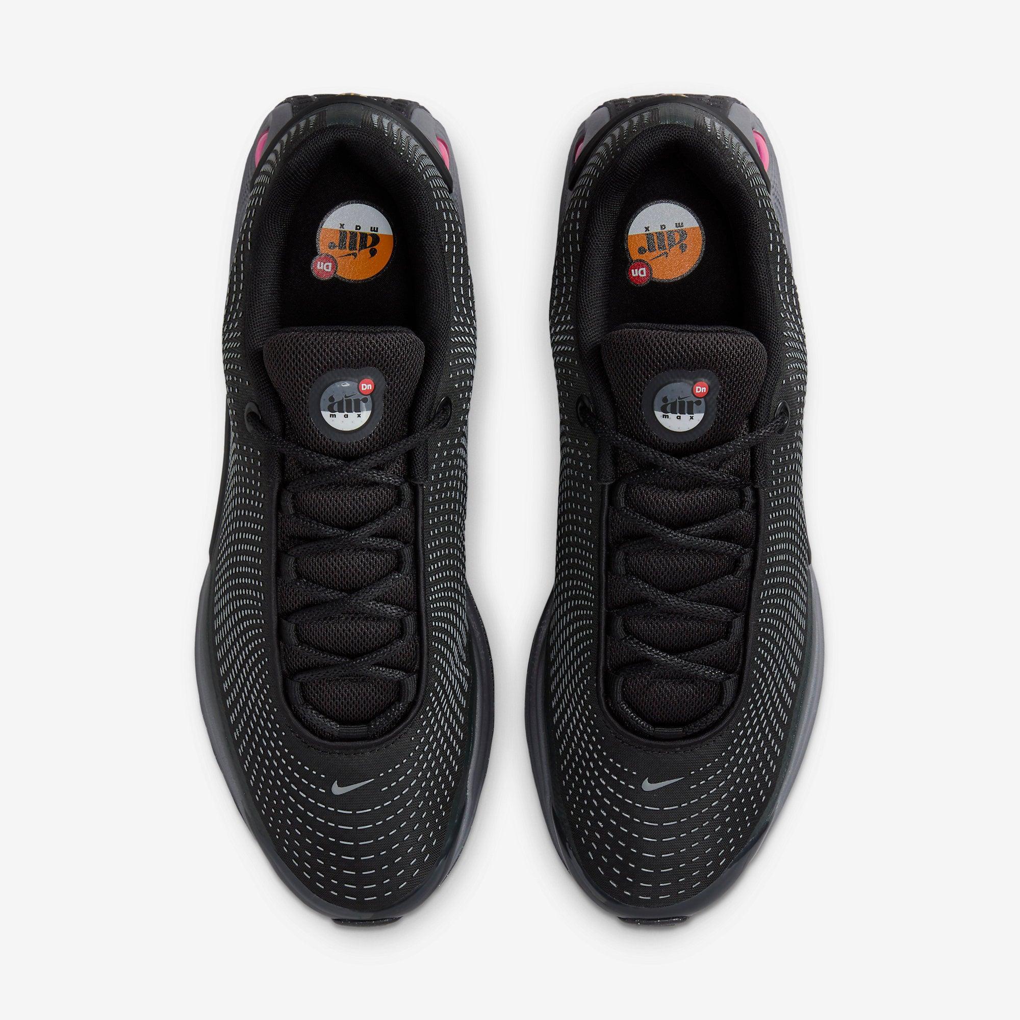 Το Nike Air Max Dn All Night είναι ένα παπούτσι που περιέχει την ολοκαίνουργια μονάδα Dynamic Air Max στη φτέρνα με μερικά χρώματα στο σχέδιο. Αυτή η επανάληψη του Nike Air Max Dn διαθέτει κυρίως μαύρο χρώμα. Το αναπνεύσιμο υφασμάτινο επάνω μέρος τονίζεται με σκούρες γκρι παύλες καπνού, δίνοντάς του ένα είδος απτικού μοτίβου. Το κάτω μέρος του επάνω μέρους στηρίζεται με μαύρα περιγράμματα, ενώ το Nike Swoosh εμφανίζεται στις καμάρες του ποδιού σε έντονο κατακόκκινο χρώμα. Τα λογότυπα Air Max φαίνονται τόσο στη γλώσσα όσο και στη φτέρνα. Το λογότυπο στη φτέρνα βρίσκεται μέσα σε ένα γυαλιστερό οβάλ που ξεθωριάζει από σκούρο μπλε σε σκούρο ροζ. Οι μονάδες Dynamic Air που είναι ορατές στη φτέρνα παίρνουν επίσης ένα ροζ χρώμα, προσθέτοντας άλλη μια λάμψη στην κατά τα άλλα ολόμαυρη σχεδίαση.